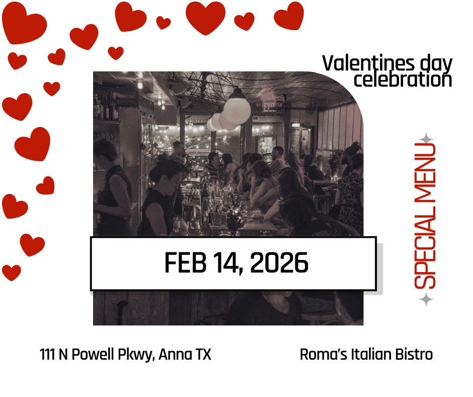 Welcome to Roma’s Italian Bistro in Anna, your neighborhood spot for warm hospitality and authentic Italian comfort food. As a family-run restaurant, we’re proud to serve our community dishes made with fresh ingredients, traditional recipes, and genuine care. From our pastas and handcrafted pizzas to your favorite appetizers and desserts, every plate is made to bring people together. Thank you for making Roma’s a part of Anna, we can’t wait to cook for you.